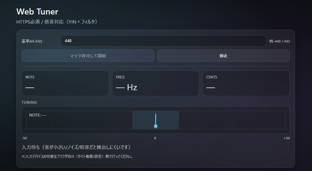 ブラウザで動作するシンプルなチューナーです。