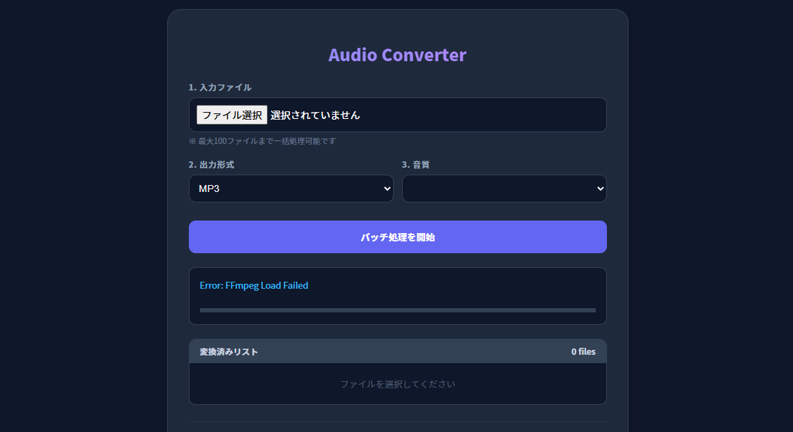 WAV、mp3、ogg、mp4からWAV、mp3、oggへのオーディオ変換ツールです。